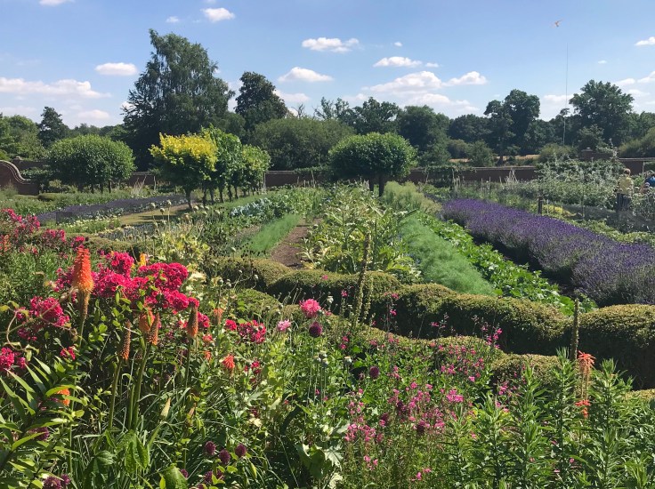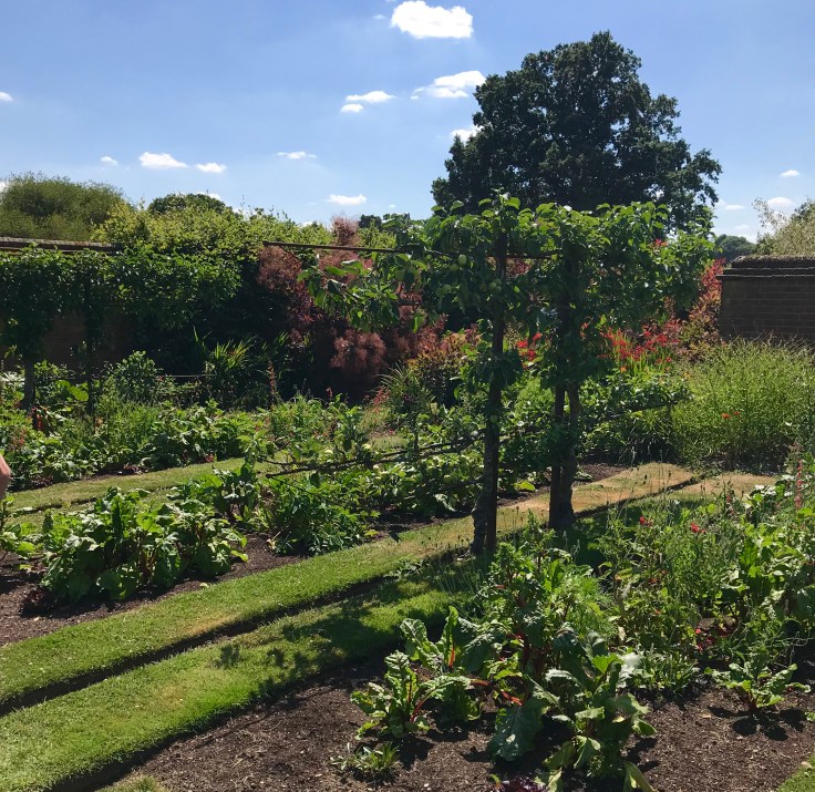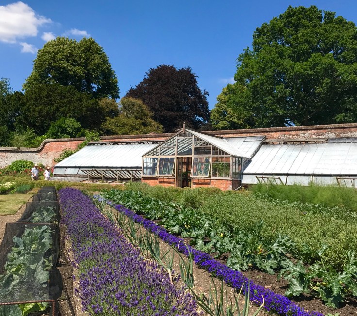The style of the walled garden is completely unlike any garden I have visited in the UK and its geometric design is quite architectural. Divided by a path with trained mulberries arching overhead, the walled garden is unusually shaped and bordered on one side by glasshouses with a hot border of perennials spilling over its wavy box confines beside long alternating ranks of vegetables and flowers in cooler tones. Ordered symmetry is key here, with angled lines leading off in mathematical precision.