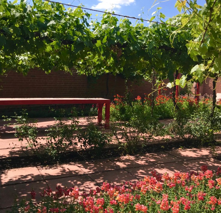 Three further walled gardens await. A red-paved garden, overhung with vines climbing red pillars features a surprising red table and rectangular beds of red and orange flowers for picking. The overall effect here is slightly oriental with the lacquered table and pillars reflecting the colour of the walls and paving.