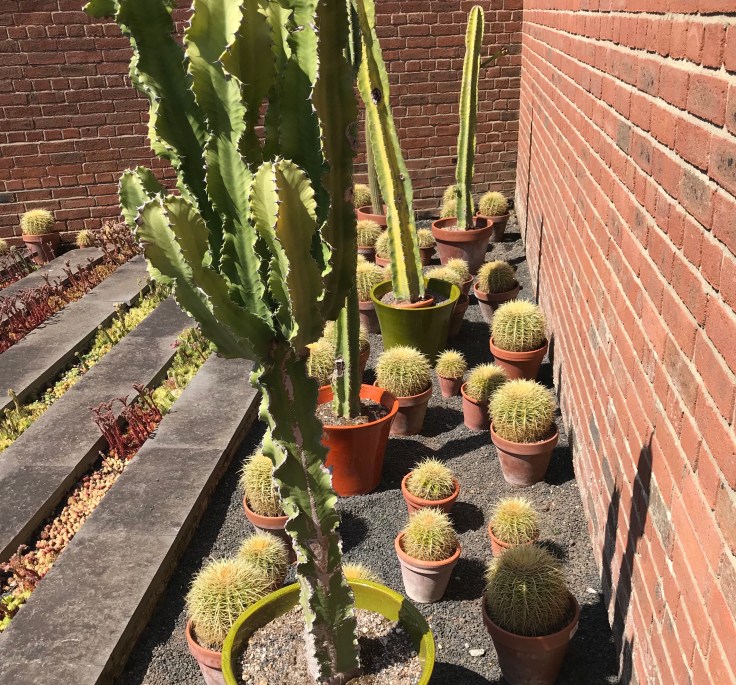 The next walled garden is even more of an eye-opener. Row after row of concrete paving slabs are interplanted with sedums and dotted with cacti filled terracotta and glazed pots. However, the overall effect is slightly marred by two or three black plastic tubs housing enormous blue agave plants.