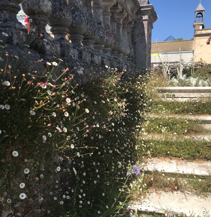 Stone steps scattered with Erigeron daisies rise toward the house where towering Verbascum push between cracks in the terrace. Beyond the house lies a lake, overlooked by sculpture.