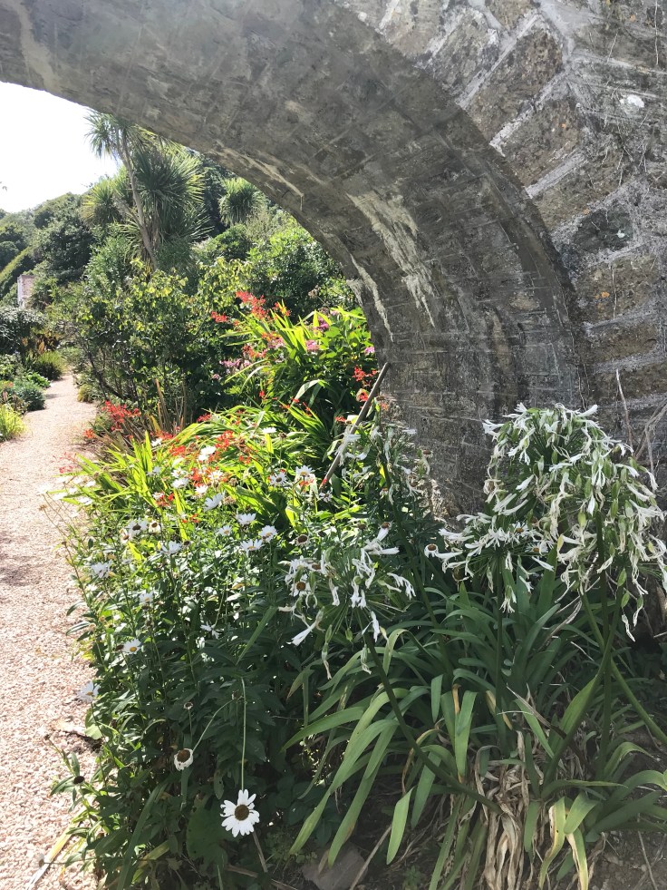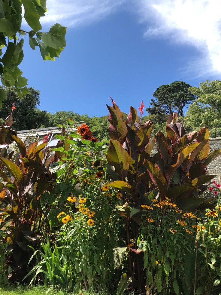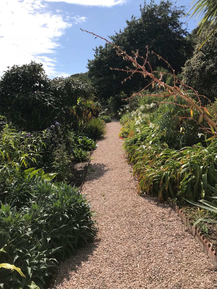 Below the lawns, a gravelled path leads through Mediterranean style planting dominated by enormous white & blue agapanthus & soaring spires of echiums. Cannas & banana plants provide a towering backdrop for the lower growing hot colours of crocosmia & rudbeckia beneath Woodcot’s other landmark, a stone bridge before the path then winds its way back towards the house & ‘that tree’, where delicious home-made teas were being served in the sunshine.