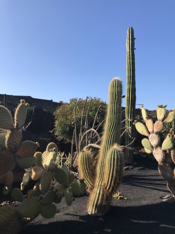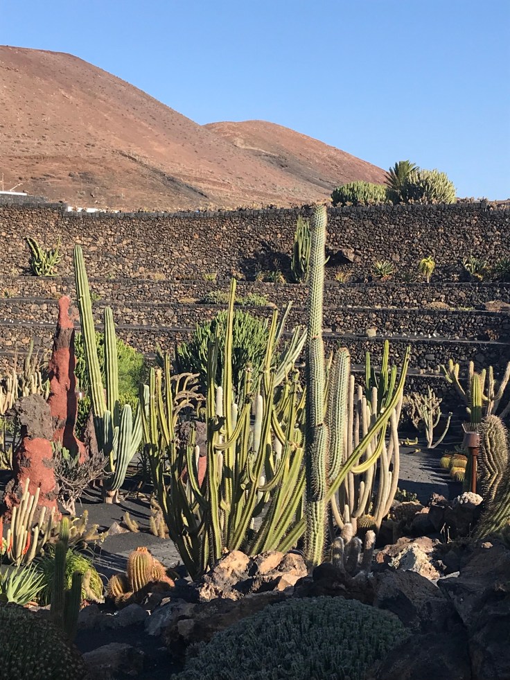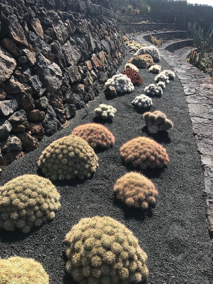 Sloping black volcanic paths, steps and terraced walks are all dotted with hundreds of cacti and succulents ranging from broccoli-shaped trees and fabulous spaghetti western style giant cacti to small hairy cucumbers and flowering cushions of spikes. The garden is complimented by bridges and flowing water dotted with goldfish and the curved paths wind around the garden allow you to walk beneath & amongst the giant cacti.