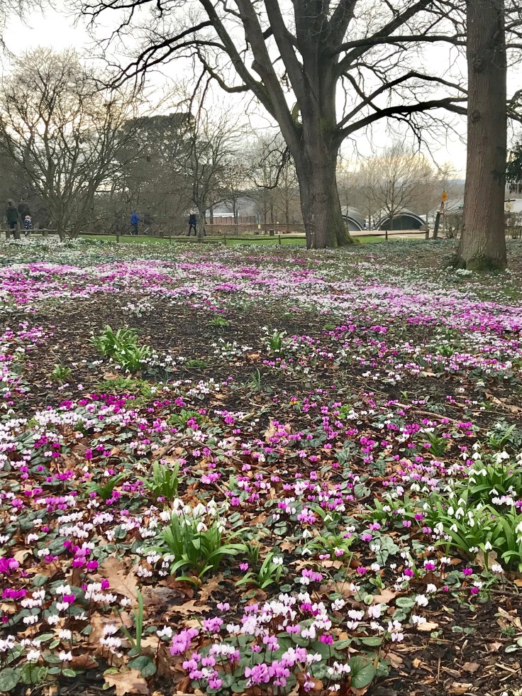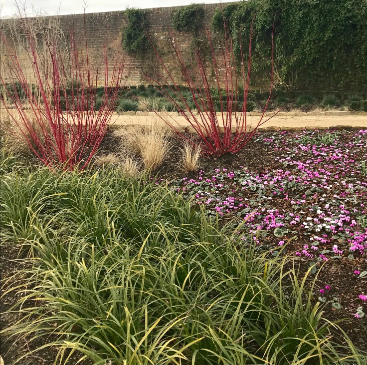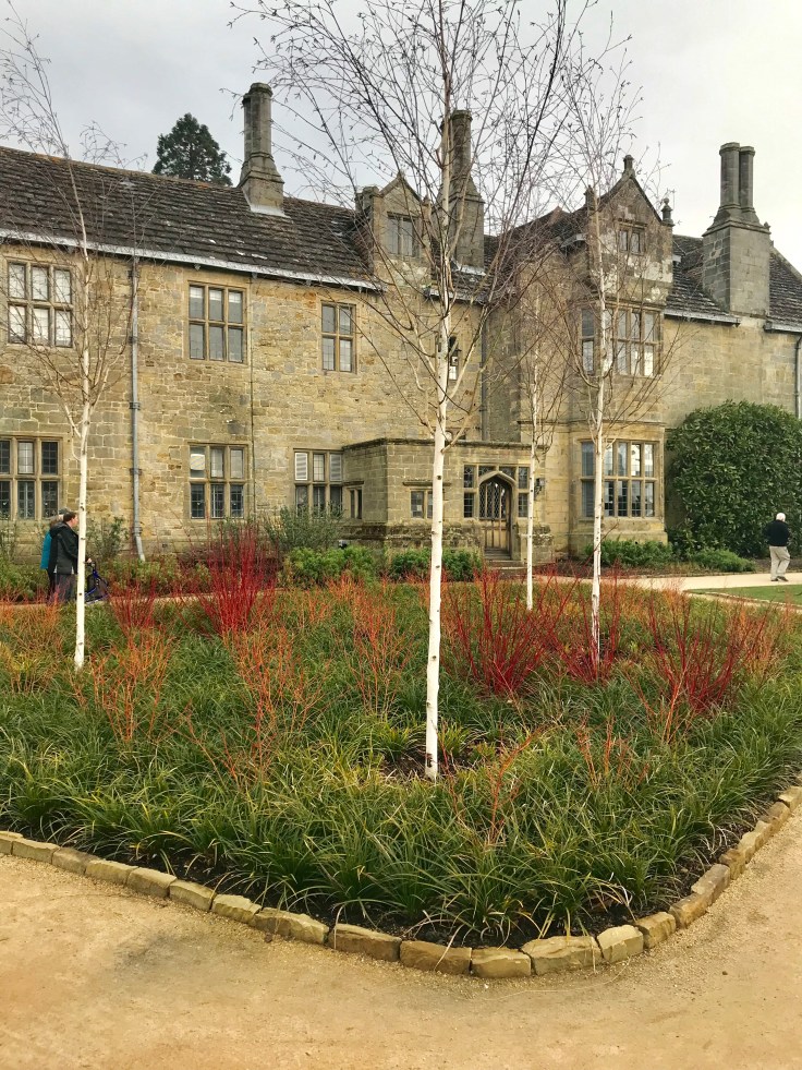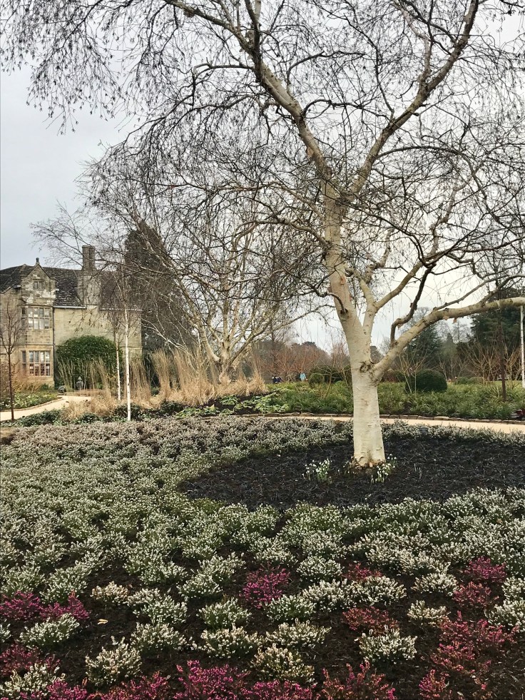 A walk around the grounds began with the new Winter Garden beside the mansion. Designed by Francis Annette, the Winter Garden is dominated by the white-barked Himalayan birch trees (Betula utilis var jacquemontii) underplanted with fiery red and yellow Cornus which would have looked stunning had the sun deigned to shine on us! Scented Daphne and (less scented) Hamamelis (Witch Hazel) line the curved path which leads to a huge swathe of ornamental grasses overlooking the sweeping expanse of lawn. Snowdrops, Cyclamen and Hellebores provide low-level colour along with a great mass of bronze-coloured Bergenia.
