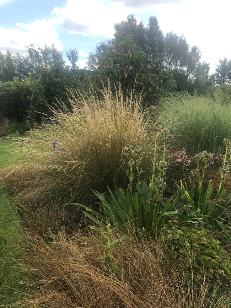 The mown pathways between the beds are cleverly planted mainly with clover and the curved beds are crammed with beautiful and sinuous grasses and bamboos, intermingled with Kniphofia, Helleniums, Clematis, Salvias and Crocosmia. September is a good time to visit, as the numerous Asters will be flowering.