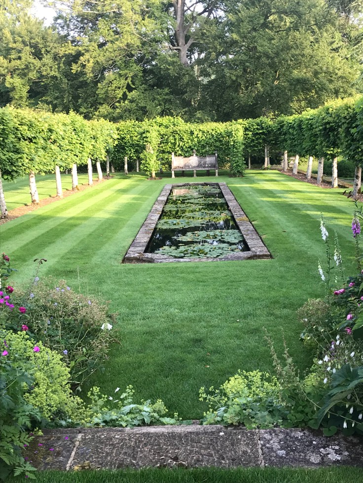 Directly beside the house, a canal pool is sheltered by six Cornus controversa variegata, also known as the wedding cake tree. This attractive pool with a bathing Brahmian bull languishing in the water is set in a grassy rectangle surrounded by irises and foxgloves.