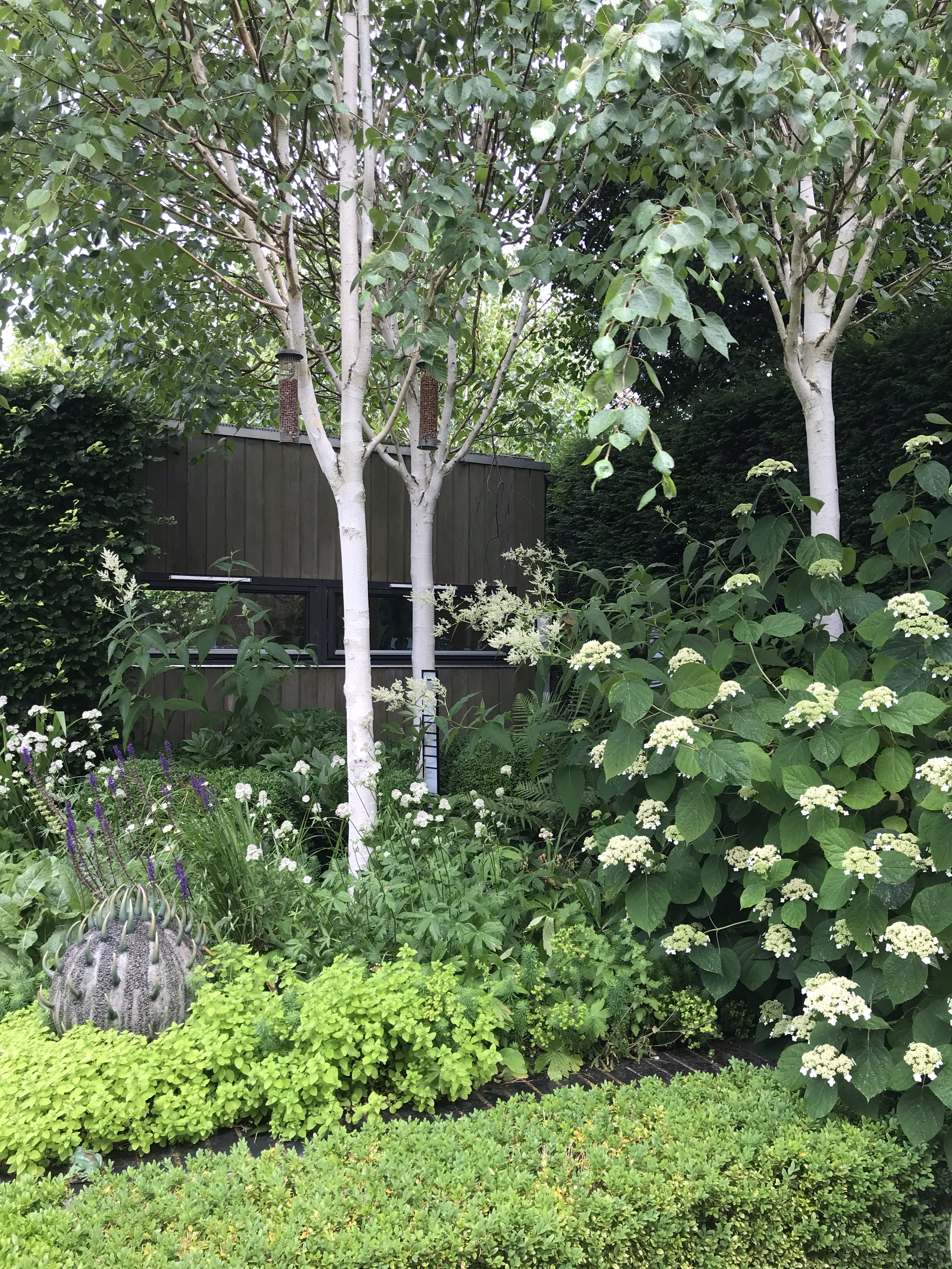 The main garden is approached via a passageway to the side of the house where literally hundreds of hostas in pots are arranged which continue around to the back garden where they hug the length of the back facade. The rear garden has been laid out in a modern-day arts and crafts style taking into account varying levels. Each level of the garden is laid out as a different room with views through to the next area. Clever use of beech columns give tantalising glimpses of secret areas and mature white-stemmed silver birch trees which lend a secluded air. Owner Nigel reveals that he washes the bark each autumn with a mop to retain its ghostly white appearance. Beside the house, white hydrangeas froth beneath more birches and steps lead up to a seating area beside a modern outdoor garden room. A shady area with more hostas and tree ferns is overlooked by a gazebo beneath which a wooden table is adorned with potted pansies. A wide path leads up through the levels; ‘wide enough for two people to walk side by side with a gin and tonic in hand’.