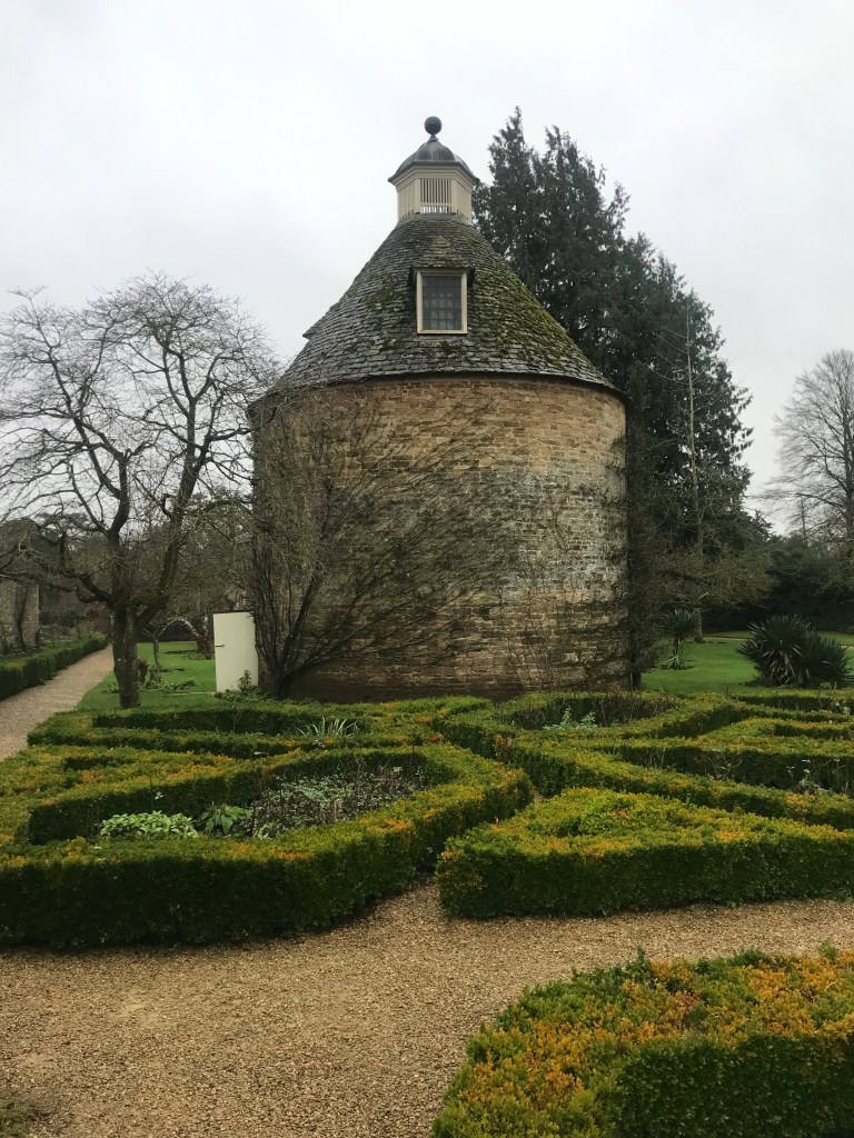 A gap in the undulating and ancient yew hedge beside the house leads you to the walled garden, where gnarled apple trees have been trained along the brick path and then beyond, a productive vegetable potager leads you through to the much photographed pigeonnier (or is it a dovecote?) which photographs so well with its espallier fruit trees trained around the rounded girth and the parterre in the foreground.