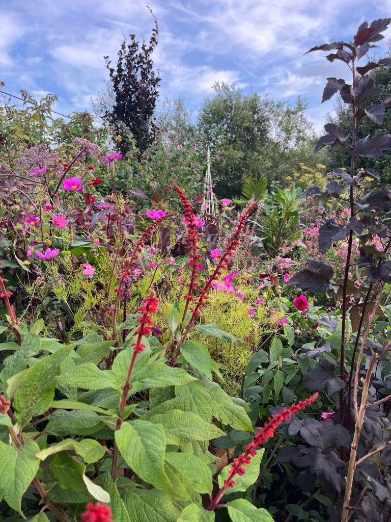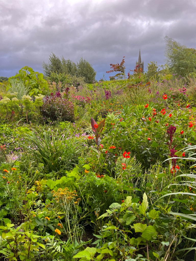 In 2020, T.J and Simon purchased an acre of land from the next-door farmer and began to created the ‘Torc’ garden which, a year later, was ready to open to the public. Wide, wide borders stretch towards the stone wall perimeter with luscious planting and plants spilling over paths. The effect is wilder, more natural and contrasts beautifully with the agricultural landscape beyond the stone wall that borders the garden. A grassy mound towards the back of the garden protects a gravelled seating area from which to sit and immerse yourself in the clever planting and watch the amazing array of butterflies and bees.