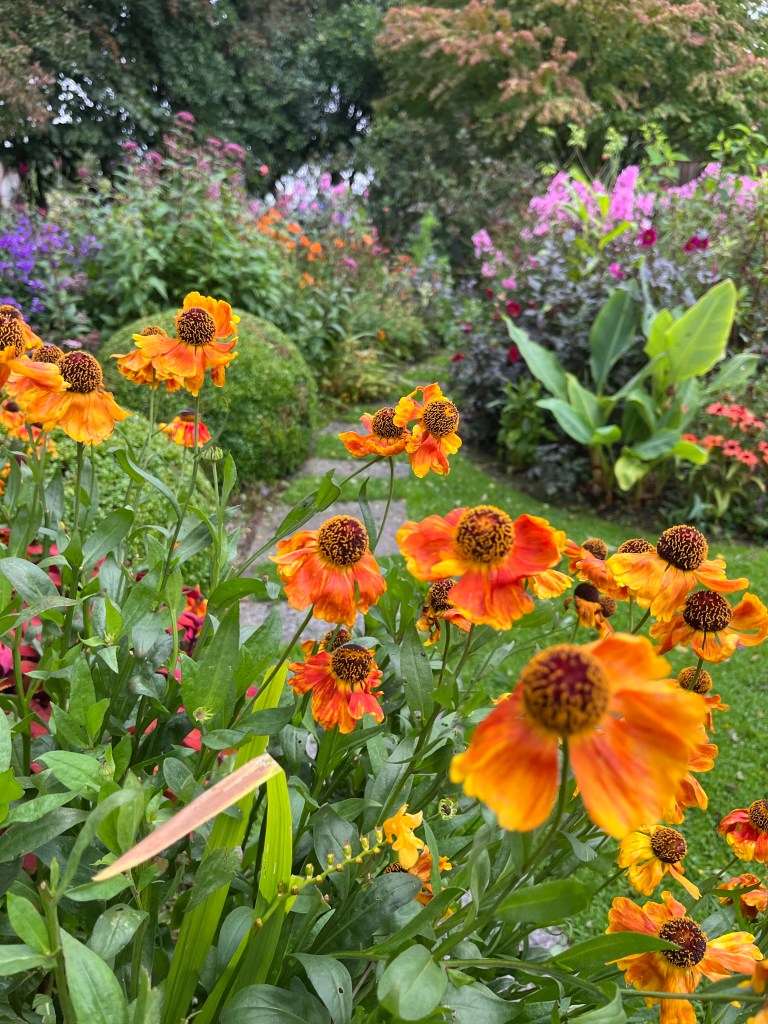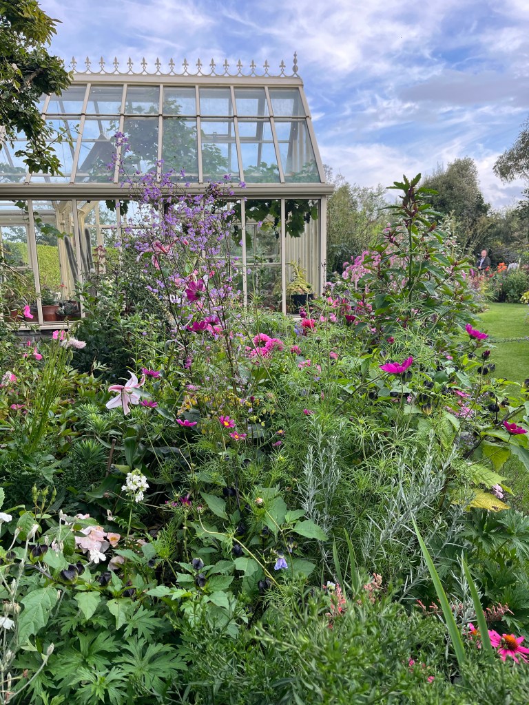 At the top of the steps, you arrive in the ‘inner garden’ where you are greeted with wide, grassy paths and deep borders of perennials, scattered with a mix of annuals, including several tender plants, protected by the high trees above. Immaculate box balls are tucked into generous beds brimming with hydrangeas and white anenomes in the white and green section, and in the pink section, a sweet shop selection of pinks, including phlox, echinacea, dahlias, gladioli and cosmos amongst others. Everywhere is colour, colour, colour and the garden simply buzzes with insects.