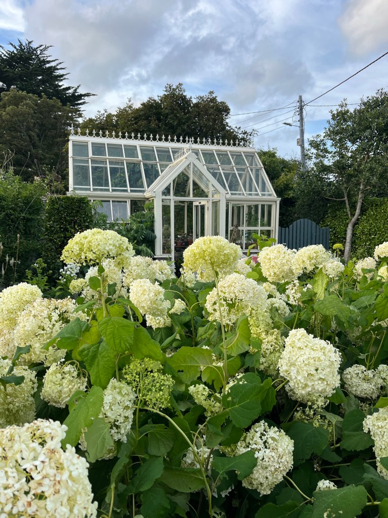It is incredible to think that twenty years ago, this glorious garden used to be a field! A wide grassy path, flanked by packed borders in shades of pink twists towards a central point where the visitor can ponder their next move. Should you take a left turn, you will find yourself in the white garden, where pillowy mounds of hydrangea Annabelle surround a sculpture created by Conall himself. Should you turn right, you will come face to face with an enormous mound of natural granite – part of which had to be cut away to form the garden. The granite has been planted not only with hardy alpines but also with a variety of aeoniums which have been tucked into little pockets in the granite. Of course the aeoniums will have to be brought inside once there is a risk of frost but during the summer months they make an unusual addition to the imposing granite.